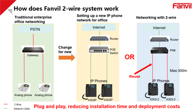 Telepon IP Fanvil X303-2 Wire adalah versi yang ditingkatkan dari telepon IP asli, yang menampilkan metode catu daya dan jaringan baru menggunakan koneksi 2 kabel. Hal ini memungkinkan penggunaan kembali kabel lama secara lengkap sambil menawarkan suara definisi tinggi, layar warna 2,4 inci, dukungan untuk 4 akun SIP, catu daya dan jaringan 2 kabel, konferensi multi-pihak, dan fitur-fitur kaya lainnya. Selain itu, telepon ini mendukung headset nirkabel EHS eksternal dan fungsi ekspansi lainnya, sehingga cocok untuk berbagai skenario aplikasi perusahaan dan memberikan pengalaman pengguna yang sangat baik.